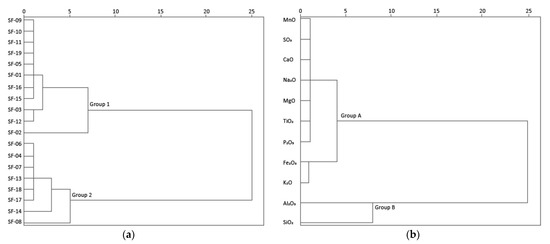 The sample’s chemical content was explored using multivariate cluster analyses. The samples major elements dendrogram revealed two major clusters (Figure 4a): Group 1 samples, which included all masonry mortars (MM) and three coating and floor mortars (CFM) samples (SF01, SF05 and SF02), a set enriched in SiO2 (50.07–63.83%), MgO (1.43–1.58%) and K2O (5.80–6.75%). The higher MgO content in group 1 (1.43–1.58%, except sample SF02), when compared to group 2, can be related to the need to increase plasticity through the addition of more plastic clays (poorer in kaolinite, richer on illite/smectite); however, it can also be ascribed to lower quality (less kaolinitic) of raw materials used, or to mortars degradation. The outlier SF02 sample, removed from a structure previously consolidated with paraloid, showed the highest SiO2 (63.83%) and the lowest K2O (5.45%) and Al2O3 (18.28%) content among group 1. Group 2 includes all brick (B) samples and the remaining CFM samples (SF04, SF06, SF07 and SF08—all opus signinum from the V to VII centuries), a set of samples enriched in Al2O3. The higher Al2O3 (28.27–32.83%) content can be ascribed to Al-rich kaolinitic clays, which highlighted the careful selection of locally (Braga region is very rich in kaolin deposits) raw materials on those materials. SF08 was revealed to be an outlier in group 2, with the lowest SiO2 and K2O contents among the group samples, which may be the result of previous contamination with fine materials. By considering the variable cluster analysis of all the samples, Al2O3 and SiO2 concentrations were distinguished from the other major elements analysed, forming a distinctive cluster (Figure 4b). A subgroup of Group A included Fe2O3 and K2O, with bricks showing lower K2O and higher Fe2O3 than mortars.