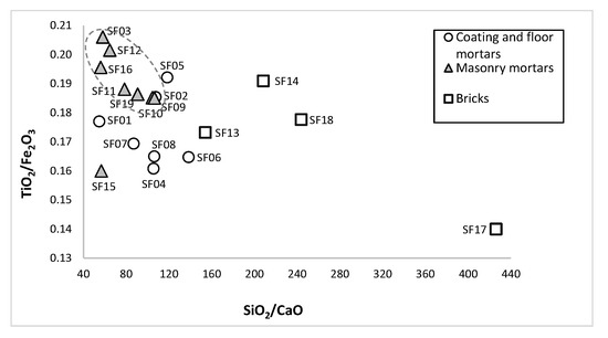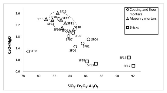 The diagram CaO + MgO vs. SiO2 + Fe2O3 + Al2O3 can be roughly related to the presence of binder and aggregate [27], respectively, since these mortars do not present calcareous aggregates. Mortars formed two groups (Figure 5): a group composed by all MM and one CFM (SF01) with a good compositional homogeneity, in the upper part of the diagram, with less binder (2.0–2.6%) and higher aggregate (80.9–84.4%) content; another group was composed by the remaining CFM samples, despite SF05 and SF07, with binder content similar to MM samples (1.9 and 1.8%, respectively). Sample SF08 revealed the lowest binder and aggregate content among mortars, possibly due to contamination with fine materials. Mortars displayed higher CaO (0.35–0.99%) and MgO (0.90–1.66%) content than bricks CaO (0.12–0.33%) and MgO (0.11–0.54%). The higher MgO content in MM samples may be the result of the application of Mg-enriched clays (non-pure kaolin) to increase mortars’ plasticity (pure kaolins are low plastic clays). Additionally, in CFM samples (opus signinum mortars with ceramic powder or fragments), an increased content of SiO2 + Al2O3 + Fe2O3 was observed when compared to masonry mortars, suggesting the use of pozzolanic materials and, therefore, the hydraulic characteristics of these mortars. Although a good degree of hydraulicity of the mortar could be attained using finely grounded bricks, if produced with poor clay raw materials, as was this case, the pozzolanic reaction could not occur due to the low amounts of amorphous materials [22,28]. Bricks showed lower binder content (0.8–1.1%) than mortars, and their aggregate content clearly falls into two distinct groups: one more similar to CFM mortars (SF18 and SF13) and another with the highest aggregate content (SF14 and SF17). The binder and aggregate proportion allowed to distinguish CFM (opus signinum mortars) from the V to VII centuries, MM from stone walls (inside funerary enclosure) from the V to VII centuries, MM and CFM (both from brick walls) from the IV to V centuries, and bricks (except lydion brick).
