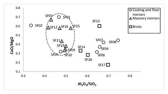 The CaO/MgO ratio showed some variability (Figure 7), which in some cases was not directly linked to the variation in calcium oxide, suggesting the use of binders from different sources. As a result, the binder materials used in MM samples SF09, SF10, SF11 and SF19 (V–VII centuries) and for CFM samples SF04, SF05, SF06, SF07 and SF08 (V–VII centuries) could have been the source. The CFM samples (SF01 and SF02) and MM samples (SF03, SF12, SF16) from the IV to V centuries showed a similar CaO/MgO ratio (between 0.58 and 0.70), suggesting the same material source. The MM sample SF15, from the II century, could have used the same binder materials source and different from samples from the IV–V centuries. The Al2O3/SiO2 ratio clearly differentiates two groups: one mainly composed of MM samples with lower Al2O3 content, and a group mainly composed of CFM samples (SF04, SF06, SF07 and SF08), suggesting a more careful selection of raw materials than other samples, as well the presence of brick particles on mortars composition. Bricks showed less homogeneous composition than mortars, although some similarities in the raw materials used could be found between SF14 and SF18 and between SF13 and SF17 samples. From the binary diagram CaO/MgO vs. Al2O3/SiO2 analyses, chemical differences were observed between CFM (opus signinum from brick walls) from the V–VII centuries, MM (from stone walls inside the funerary enclosure) and MM (from brick wall) both from the V–VII centuries, CFM (coating mortars from brick walls) from IV–V centuries and MM from the brick wall.