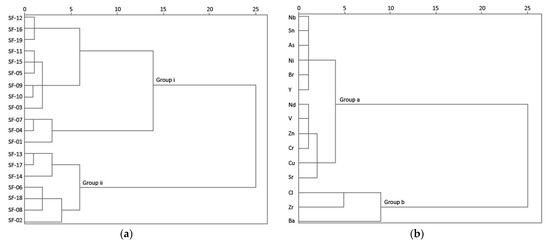 The cluster analysis of the trace elements composition showed two main samples associations (Figure 8a): group i, including MM samples and CFM SF01, SF04, SF05 and SF07 samples, and group ii, with bricks and the remaining CFM SF02, SF06 and SF08 samples. The variable cluster analysis revealed that Ba, Cl and Zr concentration trends were distinctive from the others, forming a distinctive cluster (Figure 8b). Excluding some samples, in general, group i showed higher Ba (500–900 mg/kg), Sr (86–180 mg/kg, except in SF04 and SF07 samples, with 69.2 and 77.6 mg/kg, respectively) and Cl (160–610 mg/kg, excluding SF03 and SF09 both with 120 mg/kg). In group ii, higher Zr (370–590 mg/kg, excluding SF02 with 180 mg/kg) content was found. The CFM samples SF01, SF04 and SF07 in group i (excluding SF05), formed a distinct subcluster, mainly due to its higher Cl and lower Ba and Sr contents. In group ii, the CFM samples SF02, SF06 and SF08 also formed a distinctive cluster (except for SF18, included in CFM subcluster) mainly due to their higher Ba (400–490 mg/kg) and Cl (160–280 mg/kg) and lower Zr (370–480 mg/kg, excluding SF02 with 180 mg/kg) content. Bricks showed the lowest Sr content (35.6–46.1 mg/kg excluding SF17 with 89.8 mg/kg) among all samples.
