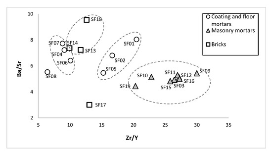 The Ba/Sr vs. Zr/Y binary diagram (Figure 9) revealed information on the employed raw materials. Lower Ba/Sr and higher Zr/Y ratios suggest the presence of natural rock fragments rather than ceramic materials (cocciopesto) in the aggregate [29]. Bricks and CFM samples presented higher Ba/Sr and lower Zr/Y ratios, which can be attributed to the presence of ceramic compounds. The CFM samples SF04, SF06, SF07 and SF08 (V–VIII centuries) showed lower Zr/Y and higher Ba/Sr ratios, with higher Al2O3, Fe2O3 and TiO2 contents than the remaining CFM samples, which suggested their higher content in ceramic compounds. As expected, MM samples showed lower Ba/Sr and higher Zr/Y ratios. The SF13 and SF14 brick samples from the IV–V centuries showed similar Ba/Sr and Zr/Y ratios and suggested the use of the same source of raw materials. As a result, through the relation between Ba/Sr vs. Zr/Y, the compositional differences allowed to distinguish CFM (opus signinum from brick walls) from V–VII centuries and MM (from brick walls) from IV–V centuries.