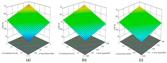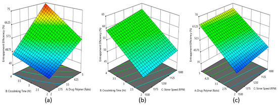 The 3D surface plot of % EE in Figure 2 signifies that the drug-to-polymer ratio had a more significant effect on % EE when compared with crosslinking time. As the drug-to-polymer ratio increased from 1:2 to 1:5, % EE increased from 40 to 57, while crosslinking time increased from 2 to 4 h and % EE increased from 40 to 48. These results are in good agreement with the % EE existing literature [51]. However, it was observed that the stirrer speed had a negative effect on % EE. Indeed, the increase in stirrer speed led to a decrease in % EE. This is probably because when the stirrer speed was increased, the particles could have broken and help the drug escape into the external phase, which resulted in lower entrapment efficiency.