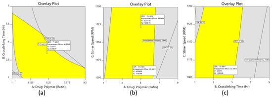 The overlay plots of the nanoparticle formulation, (a) overlay plot of the drug-to-polymer ratio and stirrer speed, (b) overlay plot of the drug-to-polymer ratio and crosslinking time, (c) overlay plot of stirrer speed and crosslinking time.