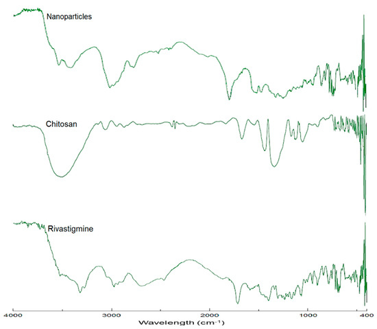 FTIR spectra of rivastigmine tartrate, chitosan, and rivastigmine-loaded nanoparticles (batch D8).