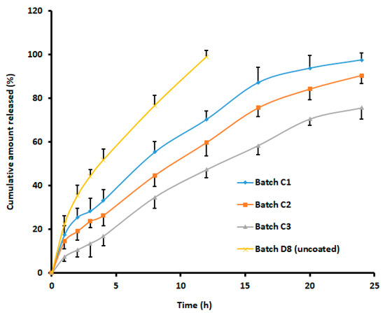 The in vitro release of rivastigmine from the eudragit-coated nanoparticles (batches C1, C2, and C3) and the optimized uncoated nanoparticle (batch D8) were studied similarly to the procedure mentioned in Section 2.6.