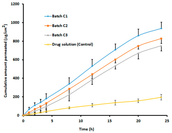 On the other hand, it was observed that % EE was significantly affected by the drug-to-polymer ratio. The % EE was inversely proportional to the drug to polymer ratio in the formulation, where 150 mg (batch P4, drug: polymer, 1:2) showed 45.34% EE but 75 mg (batch P6, drug: polymer, 1:4) showed 71.45% EE. In addition, the drug-to-polymer ratio was found to have a significant effect on drug release as well as drug permeability. It was observed that drug release and permeability retarded markedly at a higher drug-to-polymer ratio (1:4). This could be explained by the fact that the slower the rate of swelling of the polymer, the more controlled the drug release from the matrix [49,50]. Based on the results demonstrating higher % EE, controlled drug release, and sustained permeability, batch P6 with 75 mg drug and 1:4 drug-to-polymer ratio was selected for further studies.