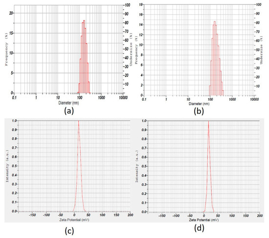 Upper panel: Representative size distribution curve of (a) uncoated (batch D8), (b) coated nanoparticles (batch C1). Lower panel: Representative zeta potential distribution pictures of (c) uncoated (batch D8), (d) coated nanoparticles (batch C1).
