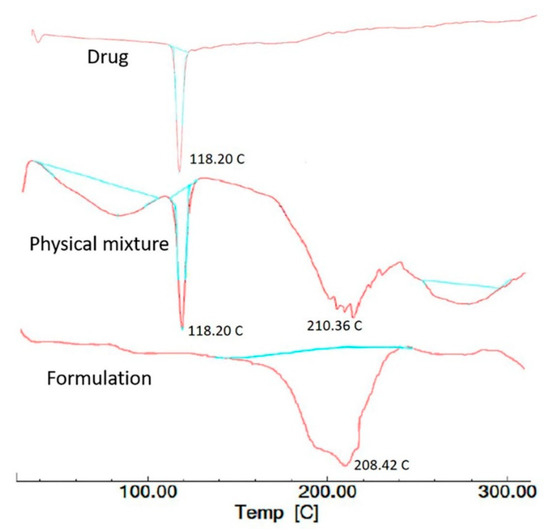 The thermal nature of rivastigmine tartrate, the physical mixture, and rivastigmine-loaded nanoparticles-optimized formulation was studied using the DSC 4000 system (Perkin Elmer, Waltham, MA, USA). A sample (5 mg) of rivastigmine nanoparticles was precisely weighed and hermetically sealed in aluminum pans. Thermograms were captured by heating samples at a constant rate of 10 °C/min from 30–300 °C. An unfilled sealed pan was employed as a reference [45].