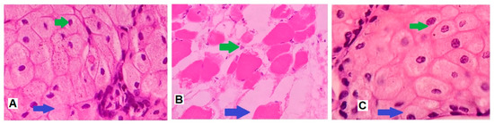 Light microscopic examination of sheep nasal mucosa stained using hematoxylin and eosin stain. (A) Negative control: nasal mucosa treated with phosphate buffer shows undamaged nasal cells with unimpaired basement membrane (blue arrow), intact glandular cells with a well-defined nucleus (green arrow). (B) Positive control: mucosa treated with isopropyl alcohol illustrates widespread destruction of nasal tissues including the injury to the basement membrane (blue arrow) and glandular cells (with consequent loss of nucleus) (green arrow). (C) Test: nasal tissue exposed to rivastigmine drug demonstrates unharmed basement membrane (blue arrow), undamaged glandular cells with distinct nuclei (green arrow).