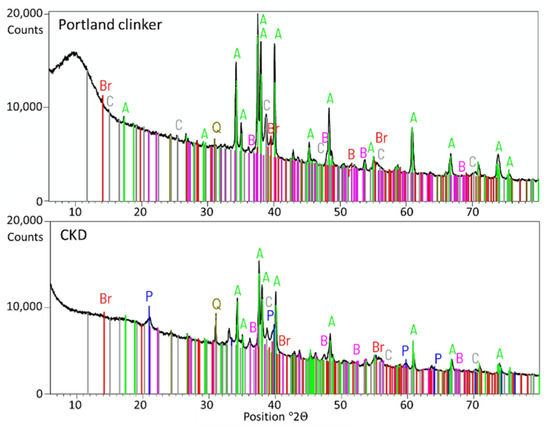 - Cement kiln dust (CKD)—obtained from one of the polish cement plants. CKD was added as an ingredient of the cement. The amount was established as 5% of total cement’s mass. The chemical composition of CKD is given in Table 2. The X-ray diffraction (XRD) analysis was conducted for CKD and Portland clinker from which manufacture the CKD was derived. The results are given in Figure 2. The similarity of constituents described in the Introduction section is visible.