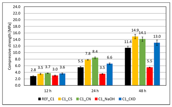 Mortar samples with dimensions 160 mm × 40 mm × 40 mm for compressive strength tests were prepared according to EN 196-1. The samples were broken into halves, which were tested. Loading area was 40 mm × 40 mm according to EN 196-1. The samples were cured for 12 h in a climatic chamber at a temperature of 20 ± 1 °C and relative humidity of 60%. After this time, the samples were demolded and then the samples were cured in water at 20 ± 1 °C. Compressive strength testing was performed after 12 h and after 1 and 2 days of curing.