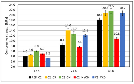 The results of the compressive strength test are given in Figure 3 and Figure 4. In the initial period of hardening—up to 48 h—the compressive strength of mortars made of Portland cement slag CEM II/B-S containing C2 clinker is higher by 30%, 35%, and 38% after 12, 24, and 48 h, respectively, than that of one containing C1 clinker. This was due to the higher content of tricalcium silicate in the C2 clinker. It is claimed that, in the initial period, the cement containing a lot of C3S and about 10% C3A provides the highest strength, especially in the case of high acid slags [10].