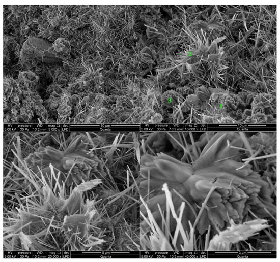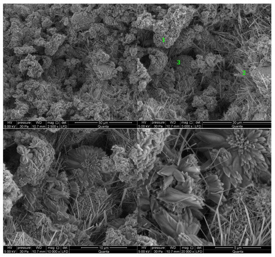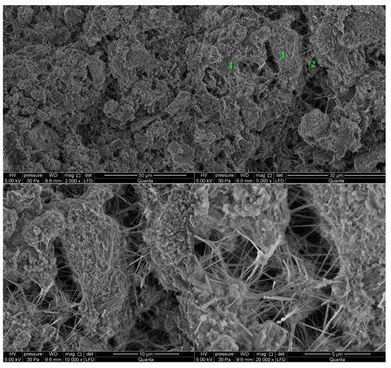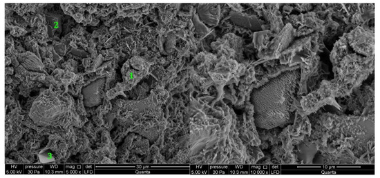 The microstructure of cement kiln dust (CKD)-modified pastes is similar to pastes without CKD, regardless of the type of clinker used to make the cement (Figure 13 and Figure 14). The difference for the analyzed areas of all samples is the presence of calcite in the form of rosettes. Its occurrence is related to the large amount of carbonates contained in CKD in the form of ignition losses. Ettringite, which did not appear in the reference sample, can be observed in the observed points of the sample of paste made from C2 clinker cement with the addition of CKD (Figure 14). The similarity to the microstructure of unmodified pastes is due to the similar dust composition of CKD and cement [64,65]. CKD usefulness is backed up also by its cooperation with GGBFS as an alkali activator for materials with latent hydraulic properties [66]. Some research reports that the density of the cement matrix is also enhanced [34].