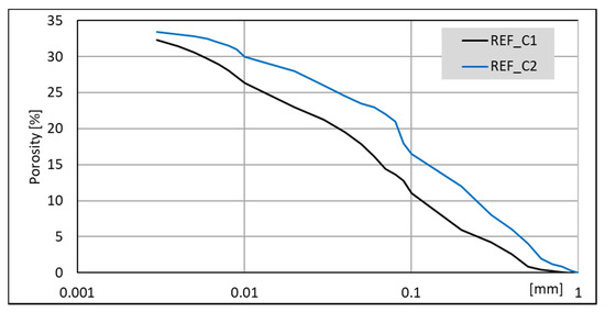 MIP cumulative results for non-modified cement pastes made with CEM II/B-S manufactured with clinkers C1 and C2.