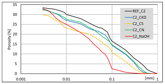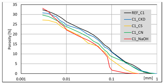 It is worth noting that while the volume of pores with different dimensions is proportional between non-modified and modified with CS, CN, and CKD pastes, the porosity of NaOH-modified pastes is different. Therefore, those pastes, made from both clinkers, exhibit a smaller amount of large pores (<0.1 mm).