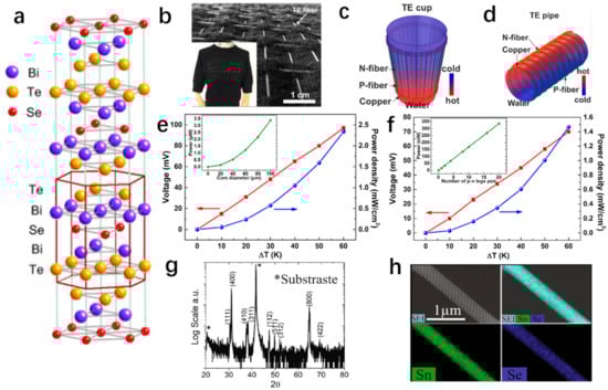 (a) Layered crystal structure of Bi2Te2Se showing the ordering of Te and Se atoms [31]. Copyright 2010 The American Physical Society. (b) The demonstration of a large surface wearable TE device, which is woven by TE fibers [29]. Copyright 2017 Elsevier. (c) The illustration of a TE cup that uses hot water to generate electricity [29]. Copyright 2017 Elsevier. (d) An illustration of a TE pipe which uses cold water to generate electricity [29]. Copyright 2017 Elsevier. (e) The function diagram shows the output voltage and power density of a TE cup covered with 7 pairs of TE fibers, which are represented by red line and blue line, respectively, within the temperature difference range of 0 to 60 K. The inside function diagram, simulated by finite element modelling (FEM), shows the relationship between the output power and the fiber core diameter at a temperature difference of 40 K [29]. Copyright 2017 Elsevier. (f) The function diagram shows the output voltage and power density of a TE pipe covered with 5 pairs of TE fibers, which are represented by red line and blue line, respectively, within the temperature difference range of 0 to 60 K. The inside function diagram, simulated by finite element modelling (FEM), shows the relationship between the output power and the fiber core diameter at a temperature difference of 40 K [29]. Copyright 2017 Elsevier. (g) X-ray diffraction pattern [19]. (h) Elemental mapping of SnSe nanowire (480 nm diameter) by scanning electron microscopy–energy dispersive X-ray spectrometry [19].