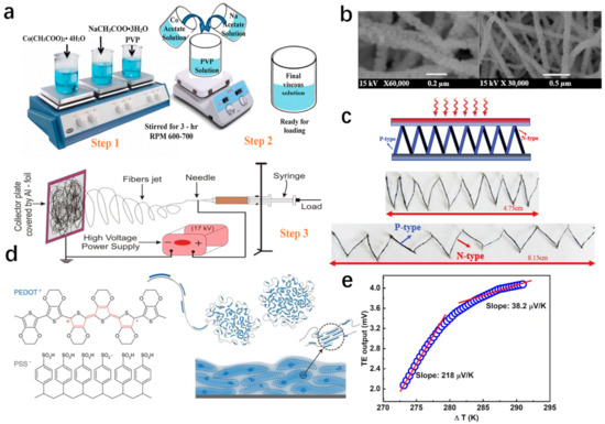 (a) The illustration for synthesis of NaCo2O4 nanofibers [84]. Copyright 2020 Springer Nature. (b) SEM micrographs of NaCo2O4 nanofibers calcined at 600 °C [84]. Copyright 2020 Springer Nature. (c) The schematic of fiber-based TE p–n pair [89]. Copyright 2019 Elsevier. (d) The Schematic diagram for the chemical structure of PEDOT: PSS and microstructure of the CP system [90]. (e) TE output voltage (∆V) vs. temperature gradient (∆T) [84]. Copyright 2020 Springer Nature.