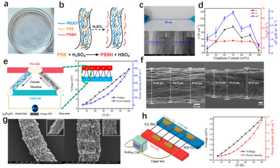 - Wen, N.; Fan, Z.; Yang, S.; Zhao, Y.; Cong, T.; Xu, S.; Zhang, H.; Wang, J.; Huang, H.; Li, C.; et al. Highly conductive, ultra-flexible and continuously processable PEDOT: PSS fibers with high thermoelectric properties for wearable energy harvesting. Nano Energy 2020, 78, 105361. [Google Scholar] [CrossRef]