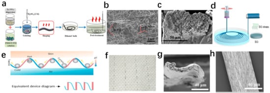(a) The preparation and post-treatment of PEDOT: PSS/Te NWs hybrid fibers [107]. Copyright 2020 Elsevier. (b) PEDOT: PSS/Te NWs hybrid fiber (the content of Te NWs is 50 wt%) [107]. Copyright 2020 Elsevier. (c) Cross-section SEM image of PEDOT: PSS/Te NWs hybrid fiber (the content of Te NWs is 50 wt%) [107]. Copyright 2020 Elsevier. (d) Schematic illustration of the wet-spinning processes [16]. Copyright 2020, American Chemical Society. (e) Schematic illustration of working principle of TE fabric (blue—PEDOT: PSS/Te, brown—Ag) [16]. Copyright 2020, American Chemical Society. (f) Photos of TE fabric [16]. Copyright 2020, American Chemical Society. (g) SEM images of PEDOT: PSS/Te NW composite fibers cross-section [16]. Copyright 2020, American Chemical Society. (h) Surface SEM images of PEDOT: PSS/Te NW composite fibers [16]. Copyright 2020, American Chemical Society.