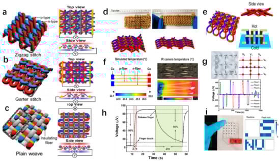 Generally, traditional film TE generators merely harvest the thermal energy in the in-plane direction without effectively utilizing the perpendicular temperature gradient between the human body and the environment [16,116]. Compared with a traditional structure, weaving TE fiber into three-dimensional structure fabric is adequate to reduce energy loss [16,111,116]. In Figure 7a, a textile structure was easily woven in a zigzag switch, and the density of TE couples was reduced due to the existence of insulating yarn. So, the power generation was as low as 0.11 Wm−2 per area at a temperature difference of 55 °C [111]. Additionally, a garter-stitch textile structure was designed without using insulating yarns. However, insulating yarns were utilized to enable better control of junction location during hand weaving, as illustrated in Figure 7b [111]. The garter-stitch textile provided output power per area and per couple for about 0.09 Wm−2 and 0.21 μW, respectively. Moreover, the tiger-yarn textile structure, a plain weave of identical segmented TE yarns with alternating segments of n- and p-type TE fibers, is shown in Figure 7c [111]. Additionally, the output power of tiger-yarn plain-weave is 0.62 Wm−2, which is higher than that of zigzag switch textile and garter-stitch textile. Improving on the previous study, Sun et al. designed a 3D thermoelectric generator without any supported substrates [116]. In Figure 7e, the π-type thermoelectric module was prepared by alternating doped carbon nanotube fibers, which were wrapped acrylic fibers [116]. This 3D thermoelectric generator was not only flexible but also stretchable by Utilizing elasticity originating from interlocked thermoelectric modules, as shown in Figure 7d [116].