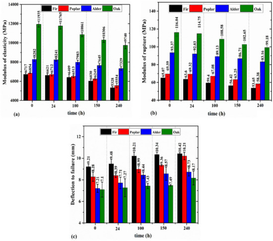 The MC and density of the wood samples decreased under weathering. Following 240 h of exposure, fir, alder, oak, and poplar wood experienced a 4.9%, 3.2%, 4.7%, and 8.1% reduction in the density, respectively. The initial MC of fir (12.1%), alder (11.6%), oak (12.4%), and poplar (12.1%) were also reduced to 6.3%, 5.3%, 5.8%, 5.3%, respectively, after 240 h of weathering. Ouadou et al. [49] reported that 120 h of weathering resulted in the mass loss due to the reduction of the MC. Figure 3 shows the impact of weathering on the MOE, MOR, and deflection to failure of different wood samples. It shows that the MOE and MOR decreased with increasing weathering duration. Overall, alder was shown to be the most resilient wood with an 11.5% and 11% reduction in its MOE and MOR after 240 h of weathering. Fir also exhibited the highest degradation, with a 21.5% and 17.5% reduction in its MOE and MOR after 240 h of weathering. The mechanical degradation under ultraviolet conditions was discussed to affect the microstructure of wood and its effect on the chemical composition and results in degradation of lignin [49]. Additionally, Persze and Tolvaj [58] explained that the higher temperatures increase the wood degradation under ultraviolet conditions. The mass loss of wood may also occur during the weathering [49]. Boonstra et al. [56] reported that wood specimens conditioned after weathering showed lower reduction in the mechanical properties. Thus, the mechanical degradation observed in Figure 3 is affected by the combined impact of the UV radiation and temperature condition resulting in mass loss due to reduction in the MC.