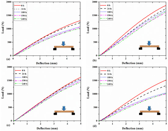 The load–deflection diagram for (a) fir, (b) alder, (c) oak, and (d) poplar wood samples exposed to different times of weathering.