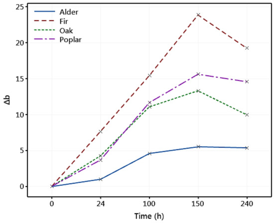 Variation in the yellowness (Δb) of the wood samples exposed to weathering is shown in Figure 7. It can be seen that the yellowness increased with exposure time and reached its maximum value after 150 h. After this time, fir poplar, and oak experienced a slight reduction in the yellowness, while it stayed almost unchanged for alder. The increase in the yellowness of the samples was discussed to be mainly due to the degradation of lignin [35,36,46]. The continuous increase of the yellowness followed by a slight reduction under artificial weathering was reported by Timar et al. [36] and Pandey [83]. Figure 7 indicates that lignin degradation occurred even after 24 h of exposure. The fir wood accounted for the highest rate of increment in the yellowness following the exposure, with the highest Δb occurring after 150 h of exposure (Δb = 23.8). On the other hand, the smallest change in the yellowness was observed in alder, suggesting a lower lignin degradation of alder wood under ultraviolet conditions compared to other species. The variation in the yellowness was almost similar in the first 100 h of the exposure for poplar and oak wood. For longer exposure times (i.e., 150 h and 240 h), the yellowness of poplar was relatively higher than that for oak.