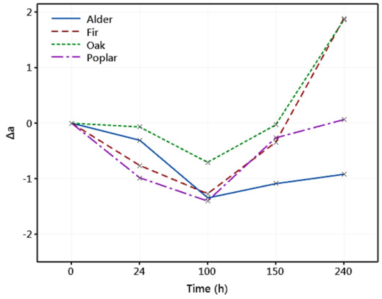 The variation in the redness (Δa) of the degraded wood samples is shown in Figure 8. It can be seen that there was a reduction in the redness of all wood species during the first 100 h of exposure. However, there was an increasing trend in the redness of the samples after 100 h. While Tolvaj and Faix [82] discussed that it is challenging to explain the wood color change in a definite way, a correlation between the Δa and the extractives content in wood has been reported in the literature [41,84]. For example, Persze and Tolvaj [58] showed that the extractives content has an important role in thermal decomposition during photodegradation. They also reported that the Δa is higher at elevated temperatures, whereas the thermal effect does not alter yellowing. It is also indicated in Figure 8 that after 240 h, fir and oak accounted for the highest increase in the redness (Δa = 1.9), while alder experienced a reduction in it. The color change parameters and the total color change for all wood species (ΔE) are listed in Table 1. It was observed that the total color change increased with the exposure time. A general trend for ΔE of fir > poplar > oak > alder was observed at all exposure times. Interestingly, fir that experienced the maximum color change showed the highest reduction in the mechanical properties, and the alder with the smallest total color change showed the minimum mechanical degradation. This indicates that the color change may be correlated with the mechanical degradation of wood and be used to predict MOE and MOR.