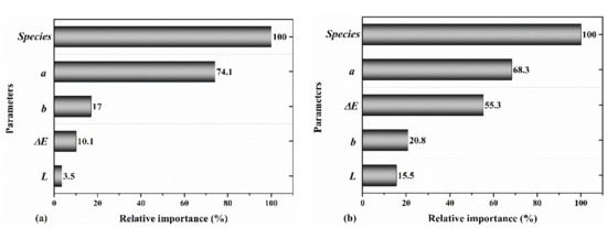 The relative importance of the wood species, a, b, and L for predicting the (a) MOE and (b) MOR.