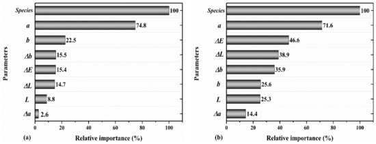 The relative importance of wood species, a, b, L, ΔE, Δa, Δb, and ΔL for predicting the (a) MOE and (b) MOR.