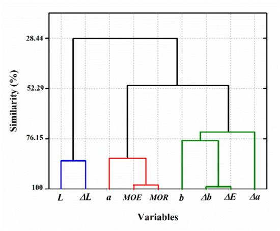 Variable clustering analysis on the color parameters, MOE and MOR (the blue, red and green lines represent the components of the CIELAB three-dimensional color space).