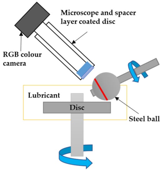 A mini traction machine (MTM) tribotester with a spacer layer imaging (SLIM) technique was used to observe the influences of adding different concentrations of oxide nanoparticles, CuO and ZnO, in the IL [N1888] [NTf2] on friction, wear, and tribofilms; thickness of a steel–steel contact. The MTM generates a sliding/rolling contact between a steel ball and steel disc, as shown in Figure 1. Film thickness formed on the ball’s surface was measured in situ within the test rig using the SLIM attachment. By one MTM-SLIM step, also called mapper step, a color optical interference image of the ball surface is automatically acquired. Through SLIM offline analysis program, the thickness of film formed on the ball is analyzed from the SLIM images. In order to take a color image in the SLIM step, the ball is unloaded from the disc and loaded against a glass window under a stationary position. This procedure is controlled automatically by the MTM-PC software, so the test specimens are maintained in test chamber during experiments.