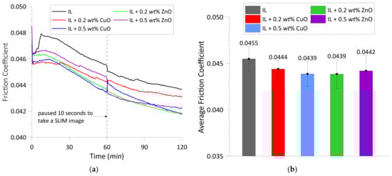 The friction coefficient data presented in Figure 2a were recorded in situ during the wear tests. The wear process was paused 10 s to take a SLIM image at the elapsed time of 60 min. This caused the change of friction coefficients because the ball was loaded to contact with the camera window, and then re-contacted with the disc at the applied load of 40 N. Many research articles have shown that extremely low friction can be observed in ILs’ lubricated contact pairs. In this study, low friction coefficients were also observed for all tested lubricants with/without the nanoparticles. The friction coefficients increased during the first 10 min, then decreased for the remaining time of the wear process. During the first 10 min of rubbing time, the running-in period, the peaks of friction coefficient in the tests with the CuO and ZnO were lower than that of the test with pure ionic liquid. It is speculated that the appearance of the nanoparticles could reduce direct contact between the ball and disc and compensate for nanodefects on the original contact surfaces. This observation is similar to the reduction in the initial friction coefficient during the running-in period, as the CuO and ZnO nanoparticles were added to lubricating oils [33].
