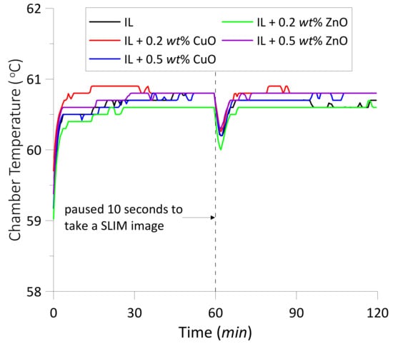 The viscosity behavior of ILs is strongly dependent on temperature and pressure [35]. The change in the IL viscosity can affect the friction as well as the nanoparticles dispersion in the IL. As mentioned above, the specimens and lubricants remained in the test chamber during the wear process, and the temperature of chamber was controlled at 60 °C. Thus, the change in chamber temperatures was tiny for all tests with/without the nanoparticles as shown in Figure 3. This has very little effect on the lubricant temperature, so the change in the IL viscosity to temperature is negligible. Furthermore, the sliding velocity and load were constant throughout the experiments. Therefore, the variation of friction coefficient in Figure 2 is considered to be independent of the working conditions and temperature.