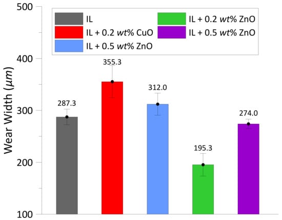The average wear widths of the disc for all test lubricants are shown in Figure 4. The CuO and ZnO nanoparticles showed different properties when they were blended into the ionic liquid. The addition of ZnO nanoparticles to IL could reduce the wear scar width better than the pure IL. In the test lubricated with 0.2 wt% ZnO, the width of wear scar was reduced by appropriately 32%. Nevertheless, the CuO particles did not exhibit good results in wear width reduction, as they increased the wear width to approximately 8.6% and 23.7% corresponding to the nanoparticle concentrations of 0.5 and 0.2 wt%, respectively. From the experimental results shown in Figure 2b and Figure 4, it can be seen that the best tribological behavior was observed at the test of IL + 0.2 wt% ZnO.