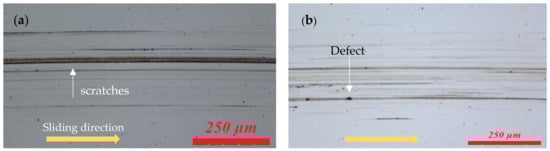 From the averaged friction coefficient values shown in Figure 2b, IL + 0.5 wt% CuO and IL + 0.2 wt% ZnO exhibit the lowest friction coefficient value of 0.0439. Compared to the test lubricated with pure IL, the friction coefficient reduced by approximately 3.5% when 0.5 wt% CuO and 0.2 wt% ZnO nanoparticles were blended to the IL. For the tests lubricated with IL + 0.2 wt% CuO and IL + 0.5 wt% ZnO, the friction coefficients were reduced by approximately 2.4% and 2.9%, respectively. The decrease in friction coefficients as adding CuO and ZnO nanoparticles to the IL can be explained by two kinds of lubrication mechanisms, named tribo-sintering and third body mechanisms [19,25,34]. The oxide nanoparticles may deposit or be tribo-sintered on wear surfaces to reduce metal-to-metal contact and act as load-bearing areas.