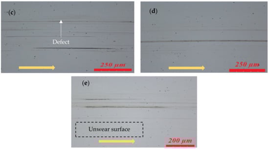 Optical micrographs of the wear surfaces on the discs from tests lubricated with the ionic liquid and different concentrations of CuO and ZnO nanoparticles: (a) IL, (b) IL + 0.2 wt% CuO, (c) IL + 0.5 wt% CuO, (d) IL + 0.2 wt% ZnO, and (e) IL + 0.5 wt% ZnO. The yellow arrows on the images show sliding directions in the wear tests.