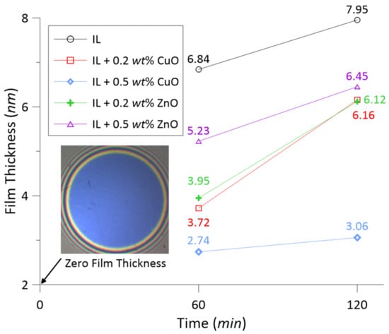 Comparing to the test of pure IL lubricant, the addition of CuO and ZnO nanoparticles caused a decrease in thickness of films as indicated in Figure 6. The decrease in film thickness can be explained due to the electropositive characteristic of the metal nanopaticles and friction pair materials; they hardly react with each other to form a protective layer. For the tests of CuO and ZnO nanolubricants, it was observed that the measured film thickness represented the same trend as the wear width (see Figure 4). In other words, when the film thickness increased, the wear width increased. The thicknesses of tribofilms were very low, only a few nanometers, so these tribofilms did not play a key role in reducing friction and wear. Hence, the anti-wear mechanism of the ionic lubricant with CuO and ZnO nanoparticles is not evaluated by the formation of protective films on wear surfaces.
