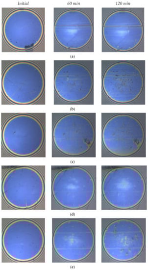 Series of interference images for different concentrations of nanoparticles after increasing rubbing time: (a) IL, (b) IL + 0.2 wt% CuO, (c) IL + 0.5 wt% CuO, (d) IL + 0.2 wt% ZnO, and (e) IL + 0.5 wt% ZnO.