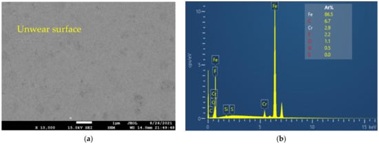 (a) SEM image and (b) EDX analysis of the unwear surface on the disc.