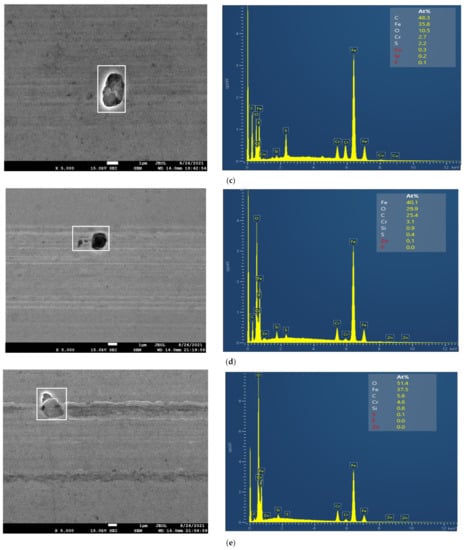 SEM micrographs of worn surface (left) and EDX analysis of defects (right) for the tests lubricated with the IL and different concentrations of nanoparticles: (a) IL, (b) IL + 0.2 wt% CuO, (c) IL + 0.5 wt% CuO, (d) IL + 0.2 wt% ZnO, and (e) IL + 0.5 wt% ZnO.