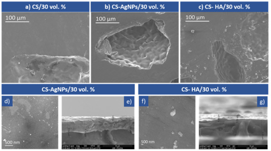 SEM micrographs of coated 30 vol.% samples: (a) CS, (b) CS-AgNPs, (c) CS-HA coatings, at low magnification, (d) higher magnification detail of CS-AgNPs, (e) cross section of CS-AgNPs/30 vol.%, (f) higher magnification detail of CS-HA, (g) cross section of CS-HA/30 vol.%.