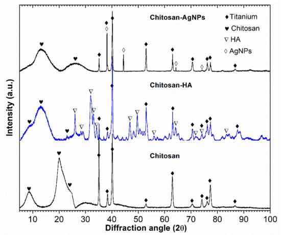 Figure 3 presents representative results of XRD phase analysis for the coated samples, which featured a superposition of sharp peaks corresponding to highly crystalline Ti substrates, with broad peaks corresponding to chitosan. Semi-crystalline chitosan (broad peaks at 2θ = 10° and 2θ = 20°), which has been con-firmed by comparison with a Joint Committee on Powder Diffraction Standards (JCPDS card, file No.039-1894). For the CS-AgNPs coating, silver peaks were identified (JCPDS card, file No. 04-0783), whereas for the CS-HA coating, hydroxyapatite peaks (JCPDS card, file No. 09-0432) were observed. In addition, α-HCP titanium peaks were visible, substrate (JCPDS card, file No. 44-1294), especially for the CS coatings. The XRD pattern indicated that chitosan displays a more amorphous form in all coatings, which may have biomedical applications [19]. These results confirmed the incorporation of nanoparticles in the CS-AgNPs and CS-HA coatings, which could further enhance their biocompatibility.