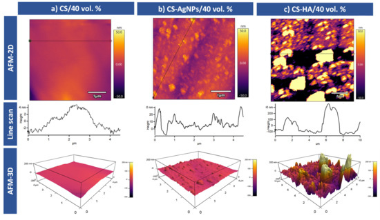 AFM topographic images for coated 40 vol.% samples: (a) CS, (b) CS-AgNPs and (c) CS-HA coatings.