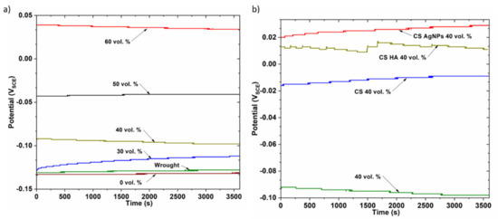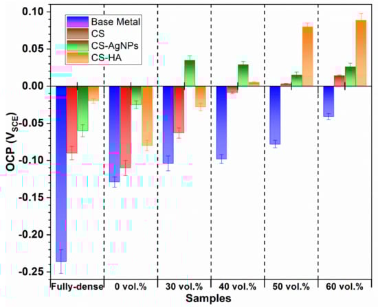 On the other hand, the open circuit potentials of CS-, CS-AgNPs- and CS-HA-coated samples were studied with immersion time in PBS solution at 37 °C. As an example, Figure 5b shows the variation of open circuit potential with time for uncoated and coated 40 vol.% samples. It was found that all the studied coatings cause an important ennobling in OCP values, which has been observed in all cases, for dense and porous samples.