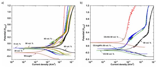 Figure 7b shows polarization curves of uncoated and coated 50 vol.% samples, it can be observed that Ecorr values of the coated samples are more anodic than the porous substrate, especially when CS was electrodeposited with AgNPs or with HA. These results clearly support the previously obtained OCP results. It is observed that after coating both cathodic and anodic current densities are significantly reduced in a large potential range, especially for the CS-HA biocomposite coating that showed a more stable and larger passive region than the others.