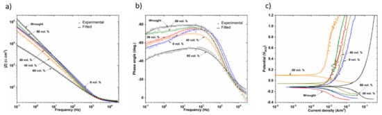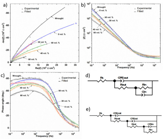 EIS measurements were performed to further investigate the influence of porosity on the corrosion behavior of dense and porous samples. The impedance data are presented as Nyquist and Bode plots (impedance modulus versus frequency and phase angle versus frequency) in Figure 8. The incomplete and depressed semicircle of larger radius corresponds to the fully dense sample in Figure 8a, while the incomplete semicircles of the smaller radius correspond to the porous samples. The most porous sample, 60 vol.%, presented the smallest radius semicircle. In addition, the impedance modulus in the mid and low frequency range, observed in the Bode diagram, Figure 8b, was lower for the most porous samples and the phase angle moved away from −90°, which is the atypical capacitive behavior of a compact oxide film, when the porosity increased, Figure 8c. All these data suggest a higher susceptibility to corrosion in the porous samples, which can probably be attributed to the heterogeneities of the oxide film formed on the inner surface, due to the difficulties of the electrolyte to access the inner of the pores.