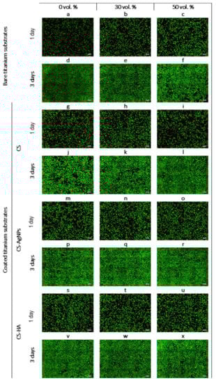 Uncoated titanium samples with 0, 30 and 50 vol.% spacers were tested to assess how porosity can affect biological properties. After titanium coated with CS, CS-AgNPs and CS-HA were tested to check the effect of the coatings of fully dense and porous samples in vitro cells behavior. A LIVE/DEAD assay was tested on seeded MC3T3-E1 preosteoblast cells in contact with the conventional PM and porous metallic substrates, compiling the results in Figure 10a–c. Viable and fixation-phase osteoblasts were observed with high percentages of cell viability, indicating the biocompatibility of the three substrates. However, some differences were observed between the almost dense and the porous substrates. In the case of porous samples, the number of cells increased and they became bigger (Figure 10b,c). This indicates that the porosity achieved a better cell response as compared to the conventional PM denser sample. The difference between the 30 vol.% sample and the 50 vol.% sample were negligible.