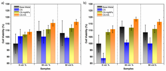 Cell viability study of coated and uncoated titanium substrates. (a) 1 day and (b) 3 days. Surfaces normalized to the positive control (uncoated samples, considered as 100% metabolic activity).