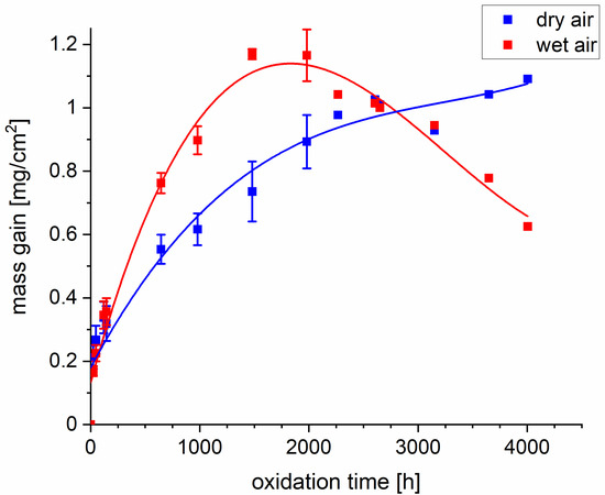Figure 1 presents curves that show the mass change of 718Plus superalloy samples oxidized in dry and wet air. For each type of atmosphere, the values for measurement points up to 120 h are mean values measured for four samples, while those for measurement points between 120 h and up to and including 1000 h are mean values for three samples. The values for measurement point between 1000 h and up to and including 2000 h are mean values measured for two samples. Finally, the values for oxidation times above 2000 h were obtained for a single sample oxidized for a total time of 4000 h. The authors are aware that the interpretation of quasi-isothermal mass change curves is prone to error, since every time the sample is cooled down to ambient temperature, its subsequent corrosion process may be affected. The conclusions drawn based on the obtained mass change curves were therefore very general. It was found that up to approximately 1500 h, the mass gain recorded for the 718Plus sample oxidized in wet air was higher than for the sample oxidized in dry air by approximately 20%. For longer oxidation times under the wet air atmosphere, mass loss was observed. It is presumed that this effect was associated with the formation of volatile chromium oxyhydroxides—mostly CrO2(OH)2—as a result of the reaction between Cr2O3 and O2 as well as H2O. It should, however, be noted that when oxidation takes place under quasi-isothermal conditions, the observed mass loss may also be due to the oxide scale spallation caused by stresses that are generated in the oxide-metal system as the sample is cooling down to ambient temperature. The co-occurrence of these two effects cannot be ruled out in this case. For the sample oxidized in dry air, on the other hand, continuous mass gain was observed; however, spallation of the oxide scale is also possible.